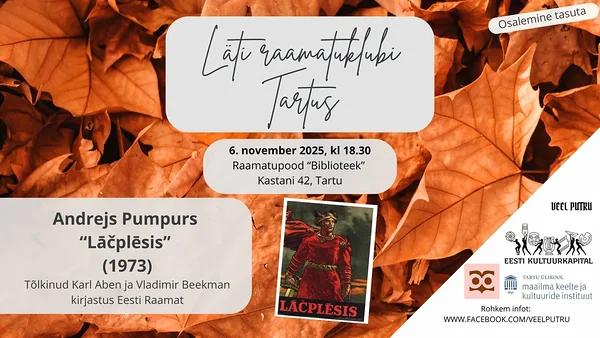 Tartu läti raamatuklubi kaheksateistkümnes kohtumine toimub 6. novembril 2025 kl 18.30 raamatupoes Biblioteek (Kastani 42, Tartu). Räägime Andrejs Pumpursi kirjutatud läti rahvuseeposest "Lāčplēsis" (Karjutapja), mille eesti keelde tõlkisid Karl Aben ja Vladimir Beekman (1973, ilmunud kirjastuses Eesti Raamat).