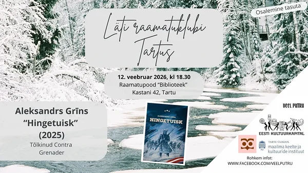 Tartu läti raamatuklubi kahekümnes kohtumine ja ühtlasi kevadhooaja avamine toimub 12. veebruaril 2026 kl 18.30 raamatupoes Biblioteek (Kastani 42, Tartu). Räägime Aleksandrs Grīnsi ajalooromaanist "Hingetuisk", mille on eesti keelde tõlkinud Contra (kirjastus Grenader).