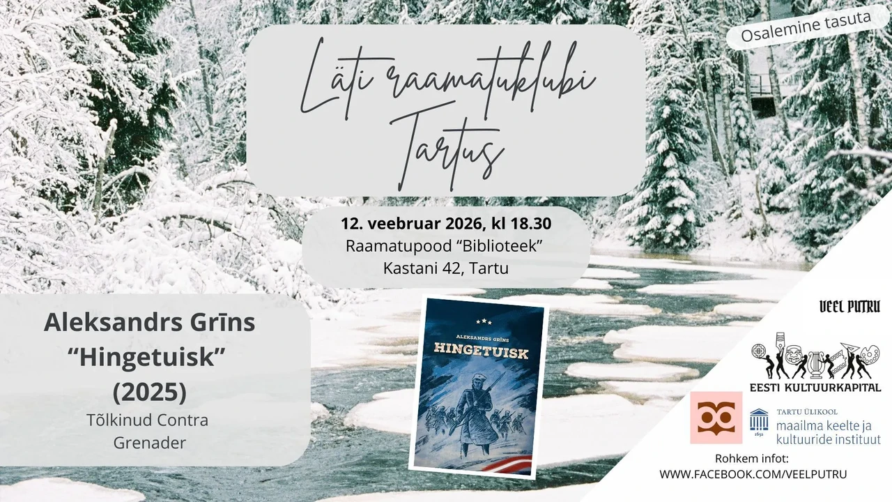 Tartu latviešu grāmatu klubiņa divdesmitā tikšanās reize un vienlaikus pavasara sezonas atklāšana notiks 2026. gada 12. februarī plkst. 18.30 grāmatnīcā Biblioteek (Kastani 42, Tartu). Runāsim par Aleksandra Grīna vēsturiskā romāna "Dvēseļu putenis" tulkojumu igauņu valodā (